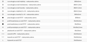 Maksymalne zakresy gięcia podano dla materiałów  o wytrzymałości poniżej 36 kg/mm² i przy stosowaniu jarzma wzmacniającego wały.